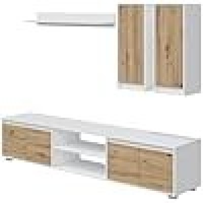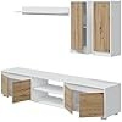 Mur équipé - ensemble de salon, salon polyvalent, composition pour le salon moderne, 200x40h14 cm, blanc et chêne
