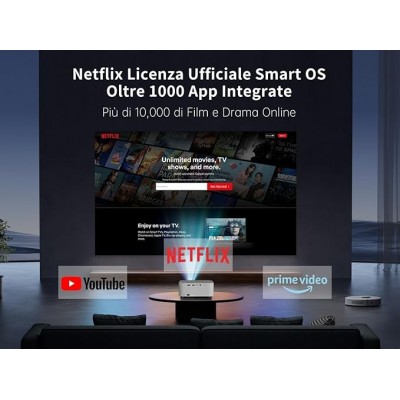 【Licenza Ufficiale Netflix】Proiettore video tv è dotato di un sistema operativo Smart integrato con app preinstallate, senza necessità di TV Stick, con un solo clic, puoi utilizzare le app ufficiali come Netflix/YouTube/PrimeVideo e altre applicazioni certificate. Proiettore portatile per home cinema offre un accesso rapido e diretto a più di 100.000 film e serie TV, garantendo un'esperienza di intrattenimento senza fine.